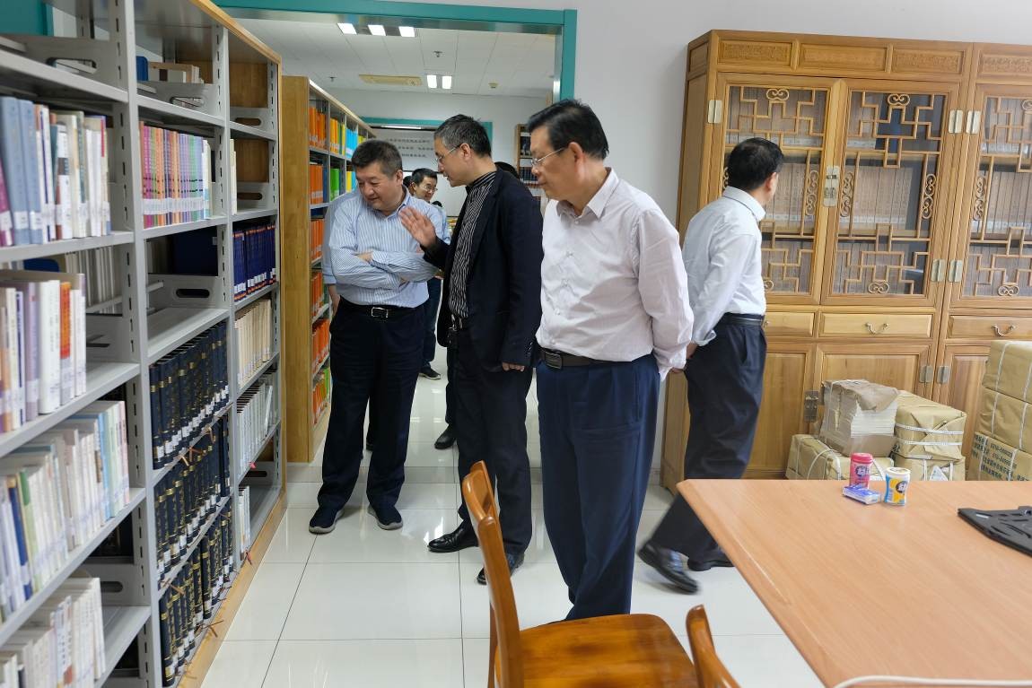 (验收专家组在研究基地成员陪同下参观图书资料室)