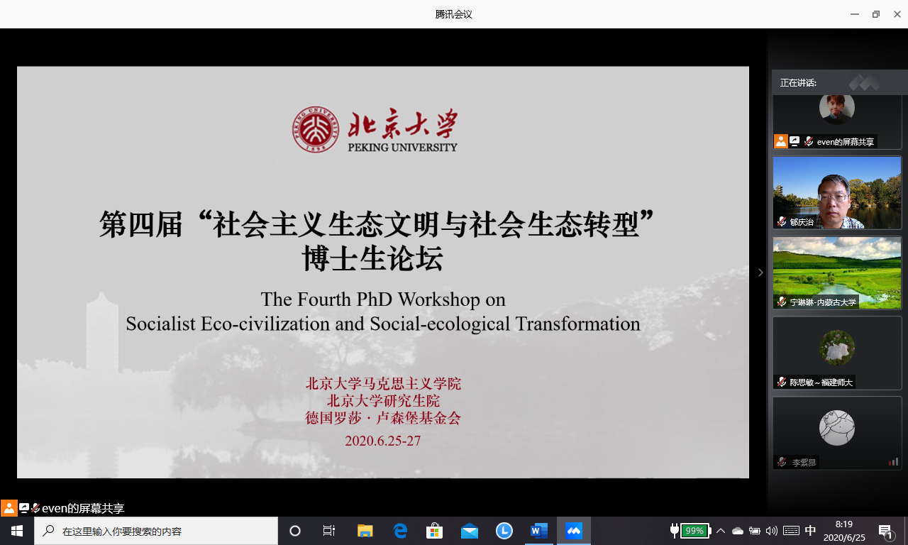 2020年6月25~27日,由304永利集团官网入口、304永利集团官网入口研究生院(“研究生教育创新计划”)和德国罗莎·卢森堡基金会共同主办的第四届“社会主义生态文明与社会生态转型博士生论坛”(线上会议)顺利举行。