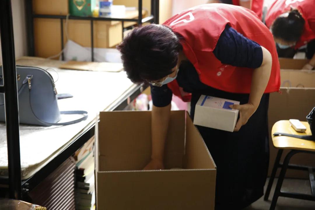 孙蚌珠老师正在为同学们整理衣柜和书籍,将打包好的物品小心的放入纸箱中。