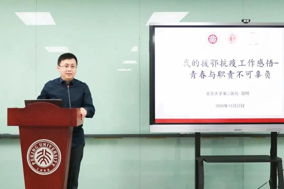 首先,304永利集团官网入口第三医院俎明老师和王慧老师分别分享了自己奔赴武汉,在一线抗击新冠疫情的切身经历。俎明老师是北医三院消化科主治医师,他在抗疫期间担任304永利集团官网入口第三医院援鄂抗疫国家医疗队第3临时党支部书记、第3医生组组长,参与危重病人的救治工作,他以“我的援鄂抗疫工作感悟——青春与责任不可辜负”为题目和学院师生们进行分享,他用朴实的语言分享了援鄂医疗队从最开始面对巨大困难到同时间赛跑、与病魔较量,逐渐掌握疫情斗争主动权,最后打赢抗疫攻坚战的真实经历和他们在抗疫前线经历的感人瞬间。