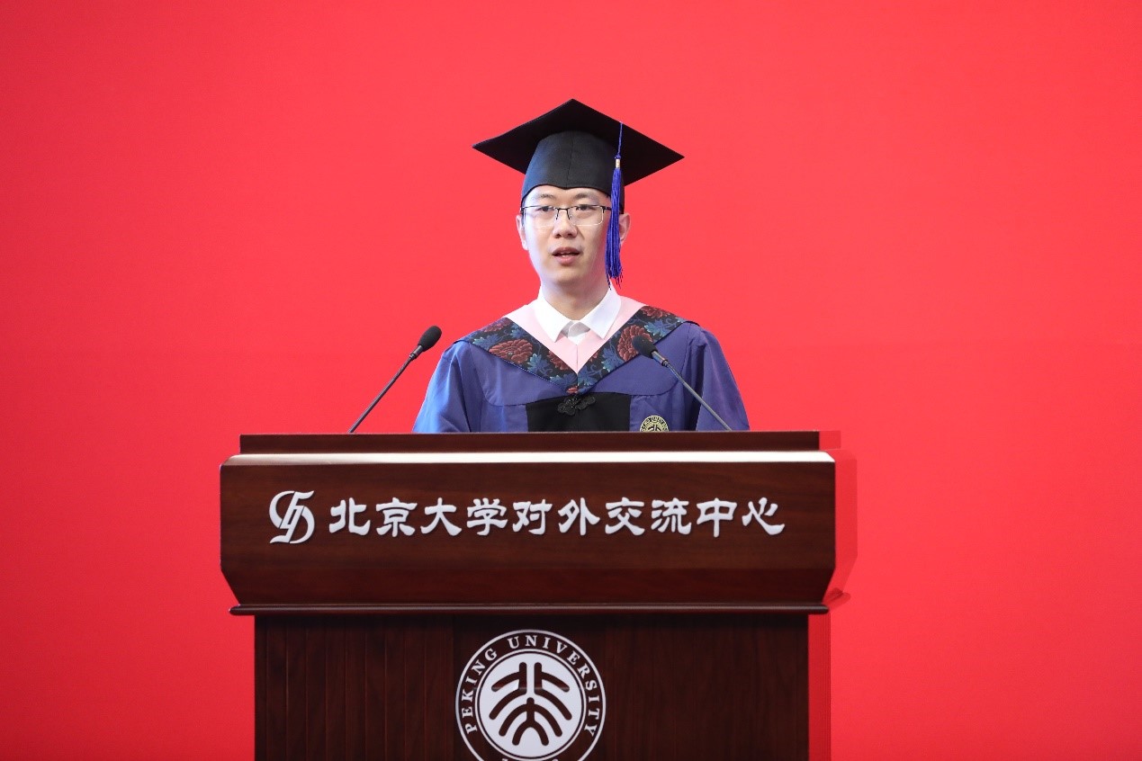 硕士毕业生代表尹航发表毕业感言。他回顾了自己在马院难忘的学习时光,感念于老师们的悉心指导、父母的殷殷关切、同窗们的深情厚谊。他表示,作为北大马院毕业的新时代青年,一定会以民族复兴为己任,不负时代,不负韶华,不负党和人民的殷切期望,以实际行动诠释“请党放心,强国有我”。