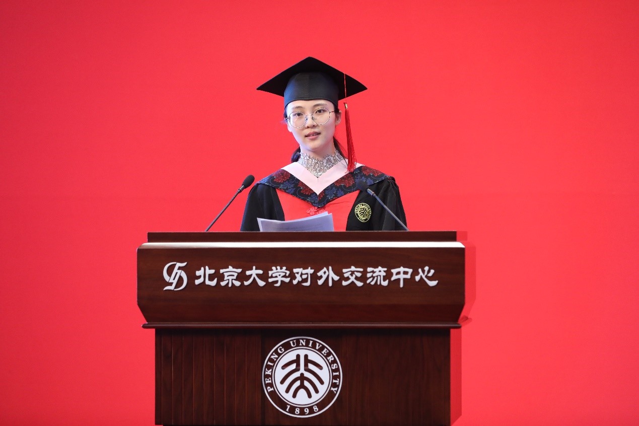 博士毕业生代表李亚男发表毕业感言。她认为北大马院教会她的不仅仅是具体的知识,更是一种科学把握世界和社会发展的思维方式,在学院学习生活树立起来的信仰,是能够滋养一生的力量。她代表博士毕业生庄严承诺:一定会牢记北大马院人的初心和使命,高举马克思主义思想火炬,自觉做马克思主义的坚定信仰者和忠实践行者,将青春理想融入到民族复兴伟大事业中。
