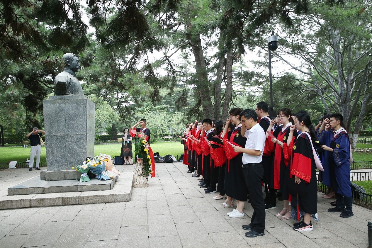 在典礼开始前,学院党委书记孙蚌珠老师、党委副书记李石生老师与全体毕业生来到校内李大钊同志塑像前,向李大钊同志敬献花篮并进行毕业宣誓。通过简短而庄重的毕业宣誓仪式,引导每一位毕业生铭记北大先贤和革命先辈教诲,传承红色基因,赓续百年征程,在党的旗帜指引下,坚定信念,坚守初心,砥砺奋斗,甘于奉献,担当时代新人责任,实现成才报国理想。