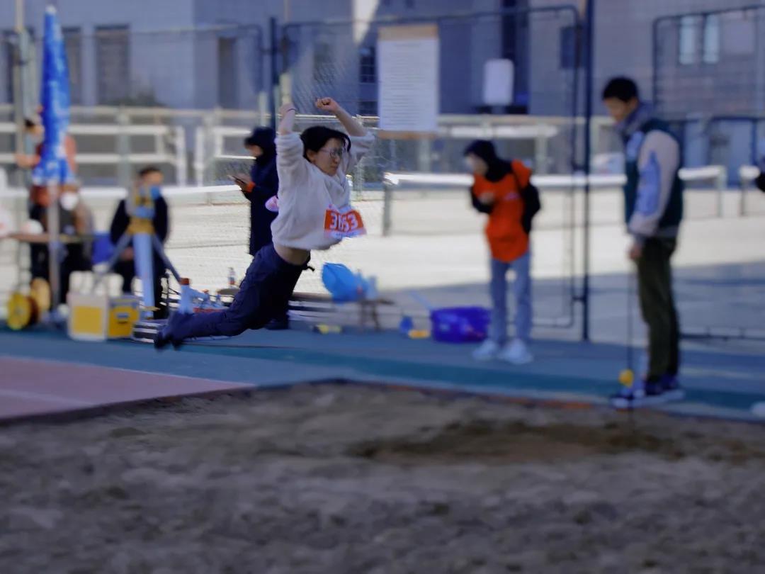 目光移至东南角的跳远赛场:赵欣怡同学在沙坑前一蹬一跃,划过一道优美弧线而后轻盈落地。她在女子立定跳远中以绝对的优势勇夺冠军,为我们本科新生取得开门红!