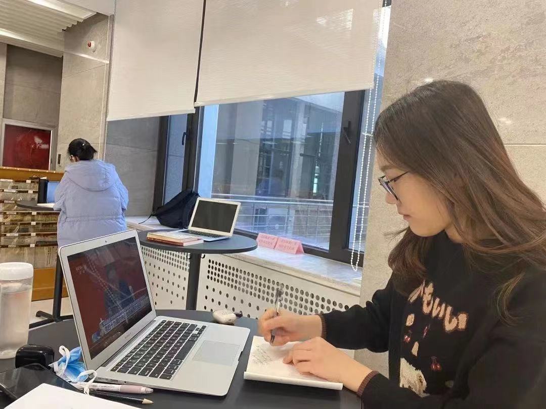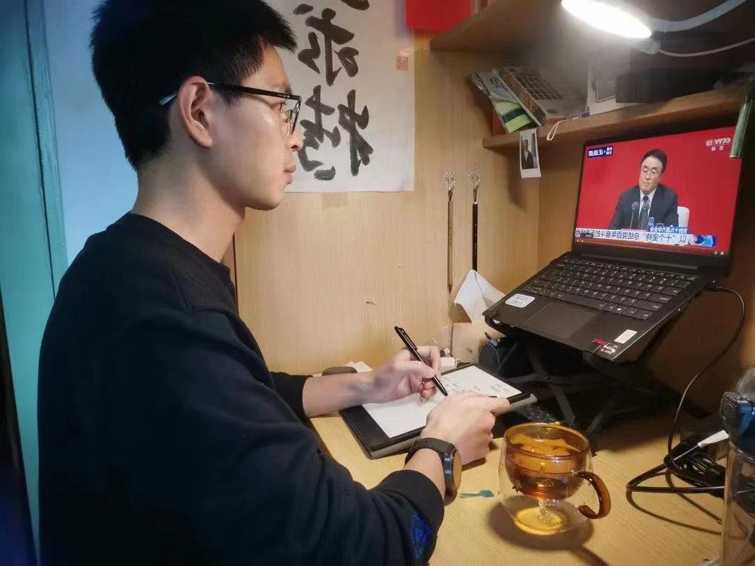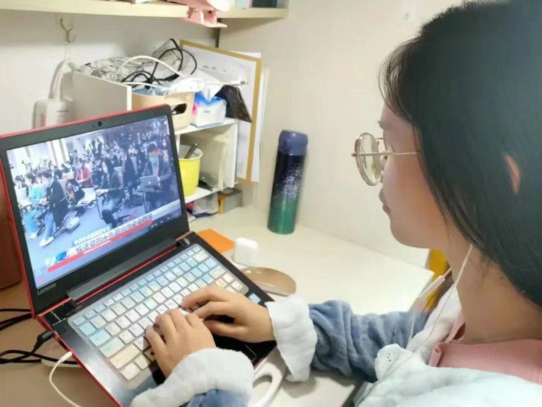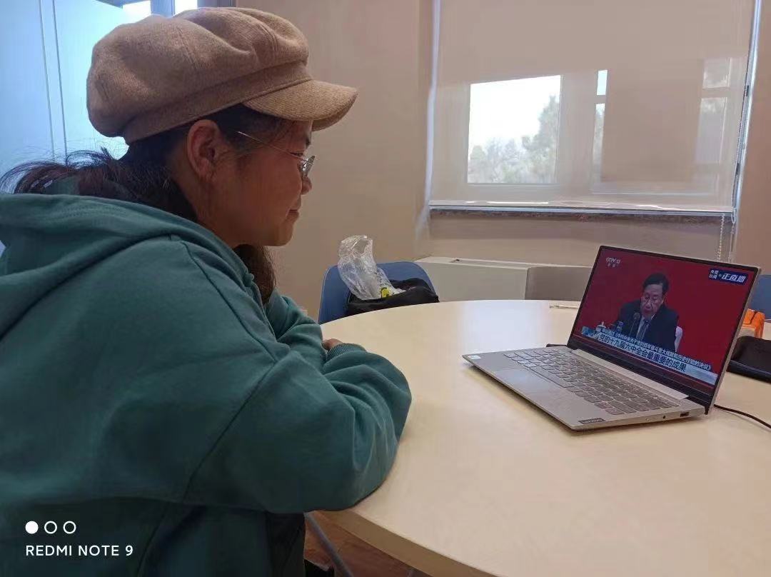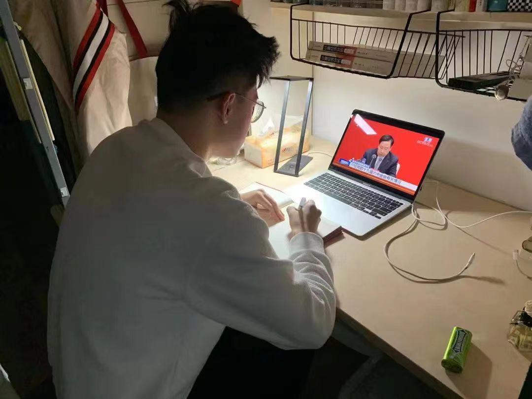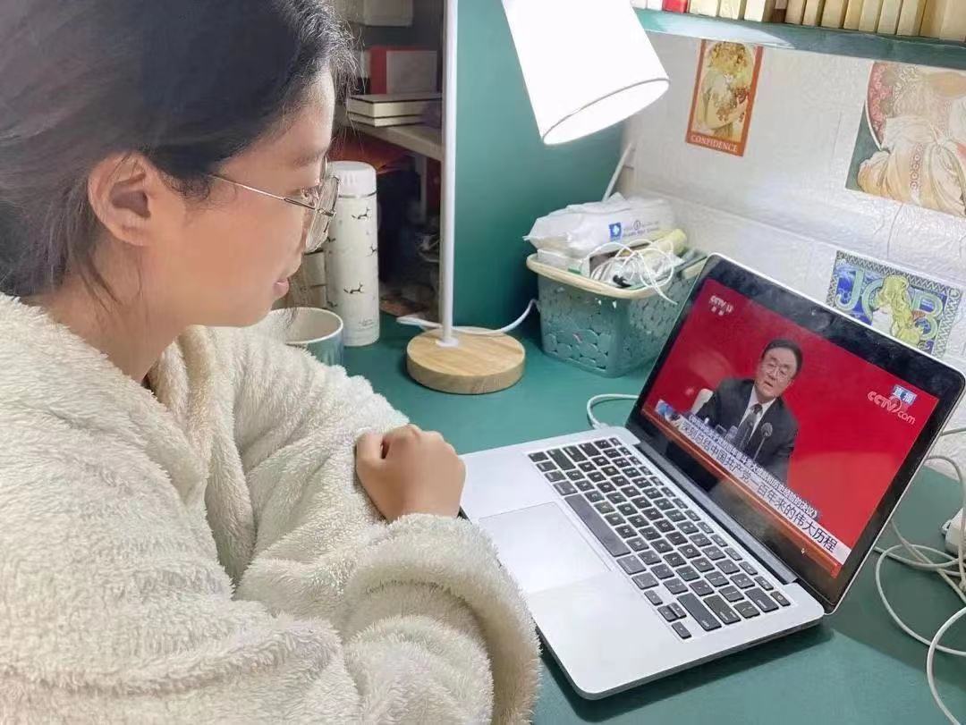 学生在宿舍、图书馆、食堂等地运用各种方式认真观看新闻发布会直播
